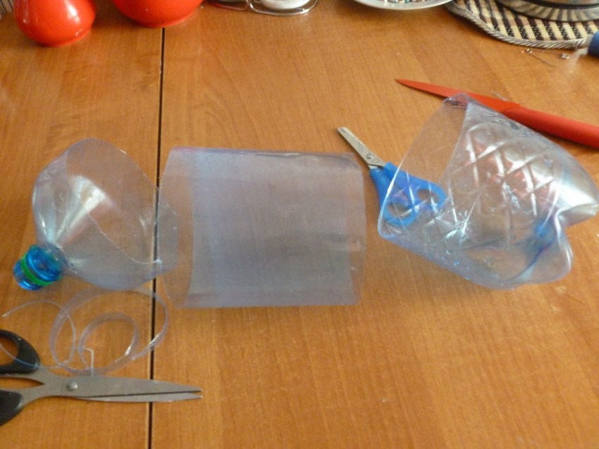 - Отрезаем верхнюю часть бутылки полукругом. Делаем надрез с помощью канцелярского ножа и прорезаем ножницами до конца.