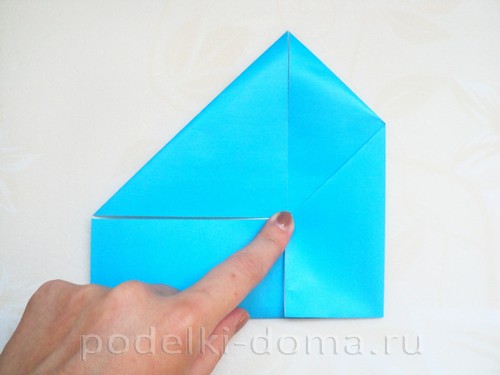 Теперь верхние уголки подгибаем к этой складке, образуя 2 одинаковых треугольника.
