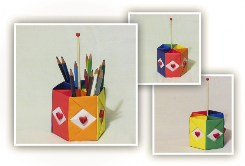 - Склеить шесть модулей между собой. Карандашница с шестью отделениями готова!
