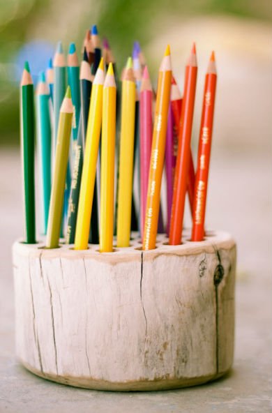 Следующей разновидностью карандашниц является изготовление из определенных частей дерева. Можно попробовать изготовить подставку из ствола дерева, что придаст свою изюминку. Следует отпилить пилой необходимую часть сухого дерева и с помощью дрели сделать много отверстий, в которые потом будут вставляться письменные принадлежности, как на данном фото: