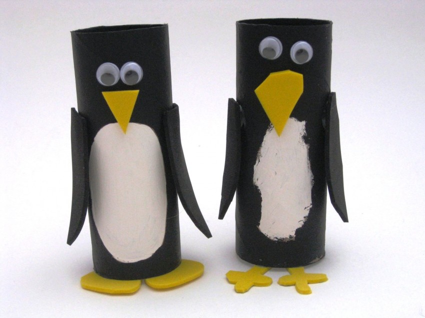 Из желтой или любой другой бумаги вырежьте огромные круглые глаза, наклейте по центру, добавьте зрачки. Белой акриловой краской нарисуйте блики. Добавьте оранжевый клюв.