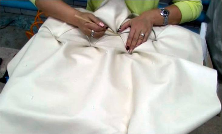 Шнуры или нити натягиваются с изнаночной стороны, вминая обивочную ткань. Нужно следить, чтобы пуговицы установились на одинаковую глубину, а обивка вминалась равномерно