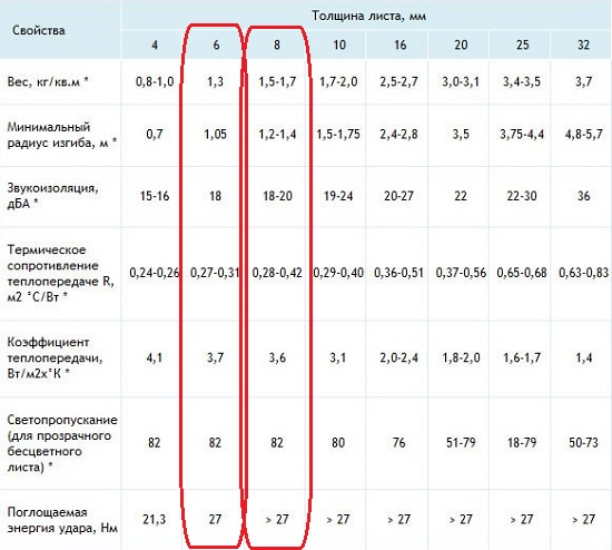Таблица основных технических характеристик поликарбонатных листов, как один из способов укрепления теплиц на зиму