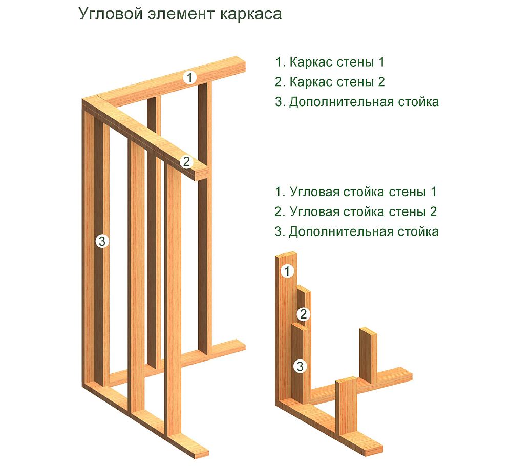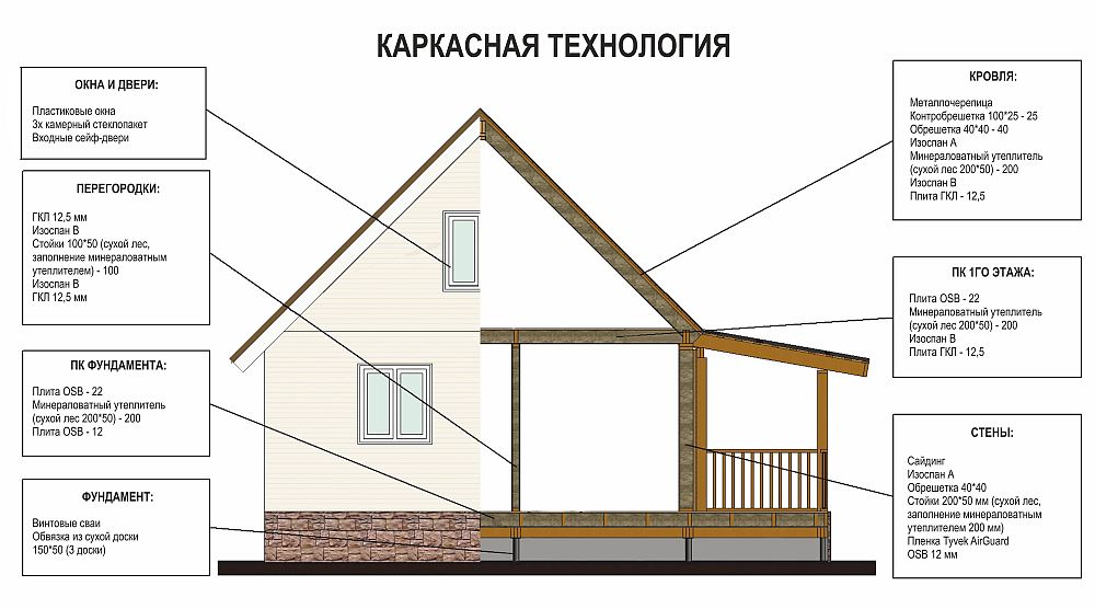Каркасные сооружения в своей основе представлены в виде легких конструкций, состоящих из небольших стоек (максимальная длина 3 метра), внутренней и наружной обшивки в виде панелей или досок, а также расположенным в стенах утеплителе.
