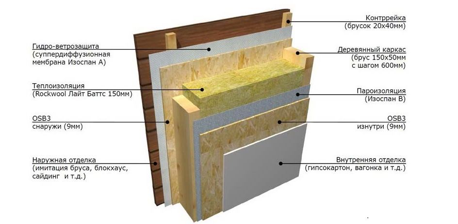 К раме из деревянного бруса крепят слои наружного ограждения (начиная с внешнего) – фасадную облицовку, ветрозащитную плиту из МДВП, установленную с вентилируемым зазором, базальтовую вату, пароизоляцию.