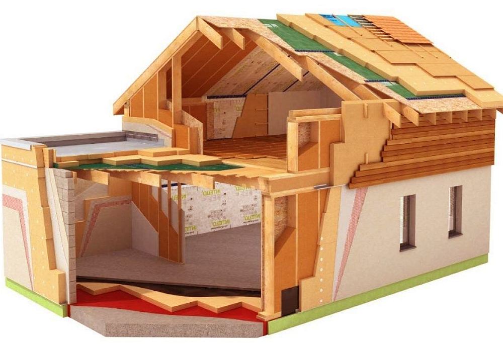 Каркас изготавливают из клееного бруса. Он прочен, долговечен, хорошо противостоит атмосферным осадкам. Жесткость придают элементы из крестообразных планок, одновременно выполняющие декоративную функцию, – ман, Андреевский крест, вильдерман. Утеплитель надежно защищен влаго- и ветронепроницаемыми мембранами.