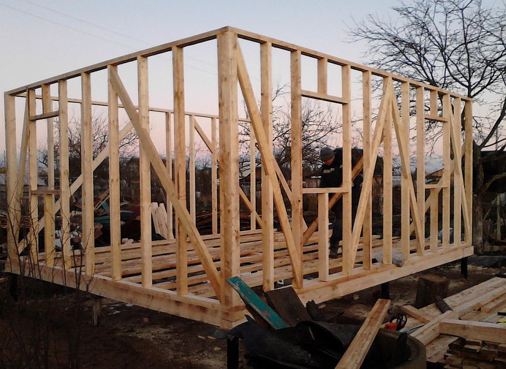 Для устойчивости каркас укрепляют укосинами или цельной обшивкой. Укосины – расположенные под углом 40-60° доски размером 100х25 мм или 150х25 мм. Верхним и нижним концами их врезают в балки обвязки, крепят по длине к стойкам на 2-3 гвоздя.