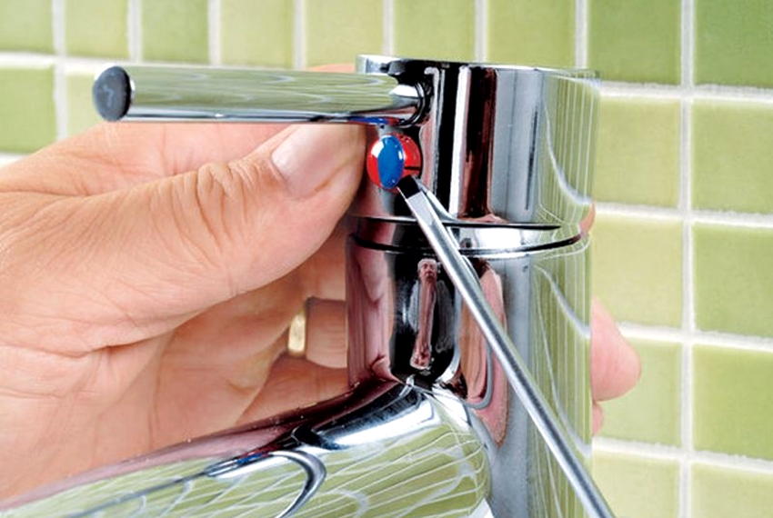 - Стараясь не повредить покрытие, подденьте ножом или тонкой отверткой декоративную заглушку, а затем удалите ее. Обычно ее легко можно узнать по метке с красным и синим цветом, обозначающими, соответственно, горячую и холодную воду. Бывает, что из-за накипи заглушку снять не удается. В этом случае ее надо обработать средством для удаления известкового налета и после непродолжительной выдержки снова попытаться вскрыть смеситель. Подобным образом следует поступать каждый раз, когда отложения солей будут мешать произвести очередную операцию.