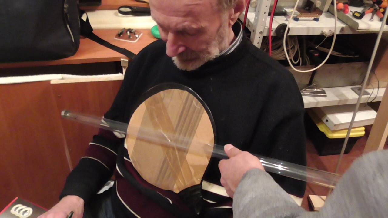 Создается катушка, которая преобразует электрические импульсы во вращающееся электростатическое поле. Плоская катушка — диск Мишина изготавливается из двух изолированных проводов, например, из МГТФ провода. Их плотно укладывают по спирали параллельно друг другу на ровном основании с центральным выступом диаметром 2,5-3 см. Диаметр всей катушки не превышает 25 см. Сверху провода можно закрепить скотчем. При уменьшении диаметра провода и общего размера катушки образуется вихревая емкость с более мощным воздействием.