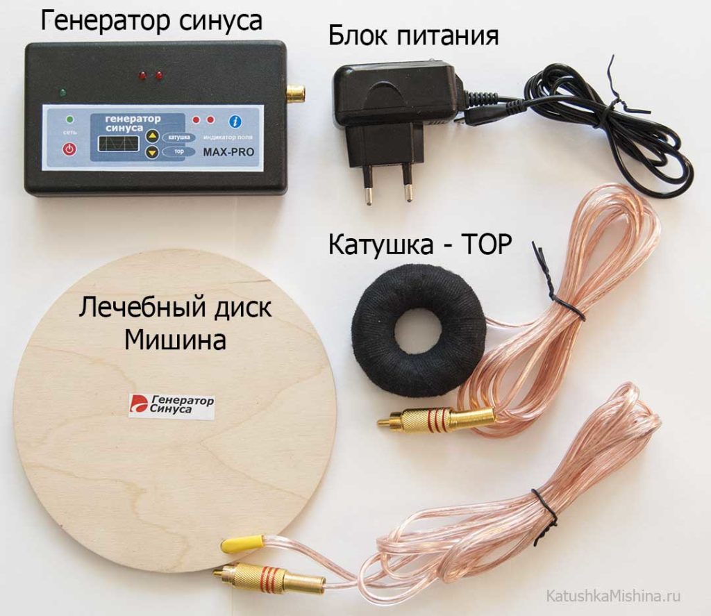 Комплектация может быть различной. Минимальная комплектация включает в себя генератор Мишина с блоком питания и одну из катушек. Генератор синуса создает резонансную частоту в лечебном диске, он начинает создавать электростатическое поле (или поле чистой статики в случае статической катушки), и можно пользоваться этим устройством.