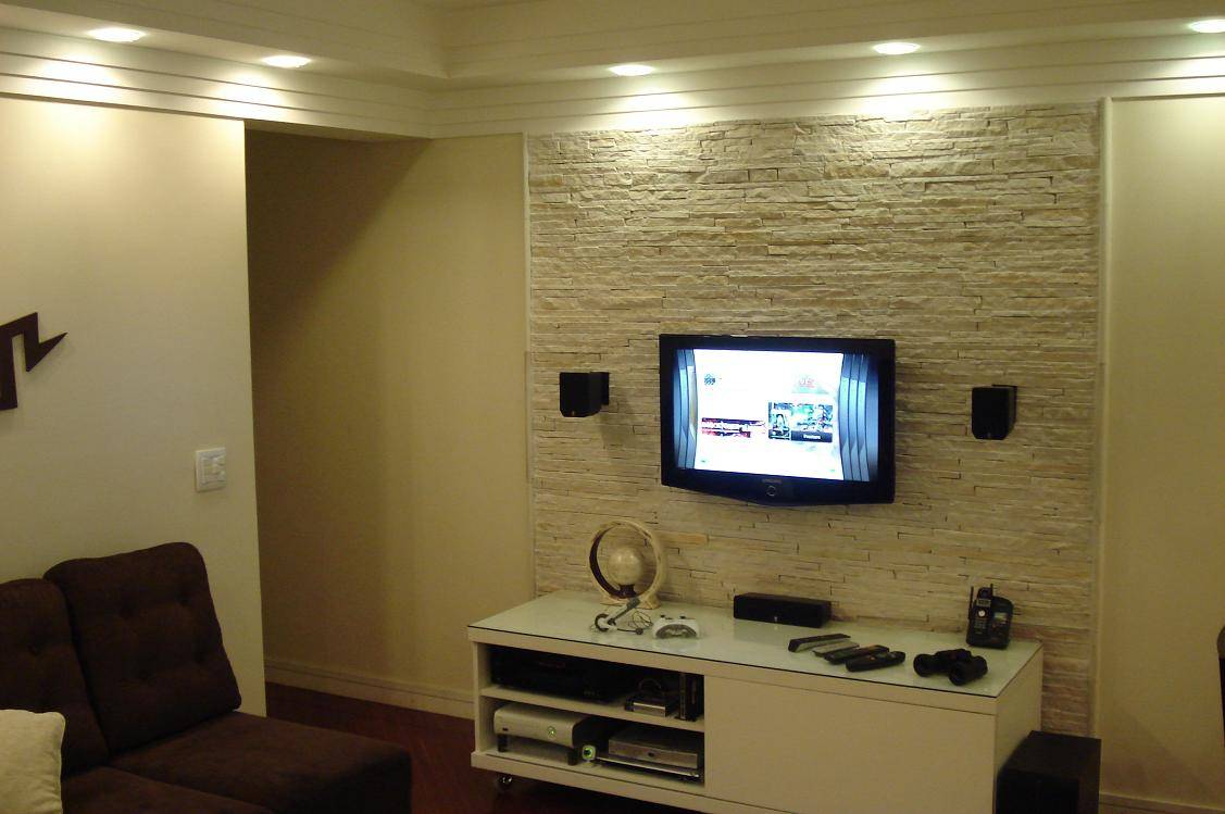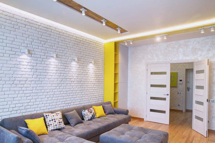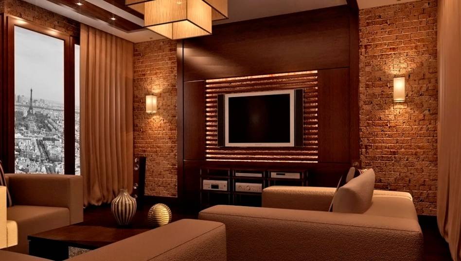 Если гостиная сделана в стиле кантри, то очень подойдет наклейка камня, имитирующего песчаник или необработанный гранит. А если в стиле лофт, то стены оформляют декоративным кирпичом.