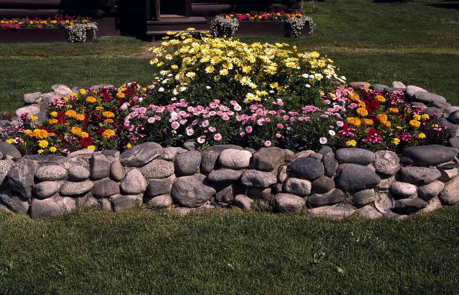 Цветочные клумбы из камней кардинально отличаются от альпийских горок и рокариев, ведь здесь зачастую не делают дренаж и высаживают любые понравившиеся растения. Камни играют всего лишь вспомогательную декоративную роль, а также служат обрамлением границ.