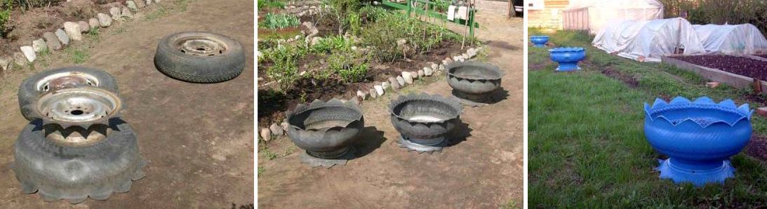 Обрезают борта шин либо просто по кругу, либо, что гораздо оригинальней, фигурно. И чем оригинальней конфигурация реза, тем красивее получится вазон. Но в этом случае потрудиться придется чуть больше.