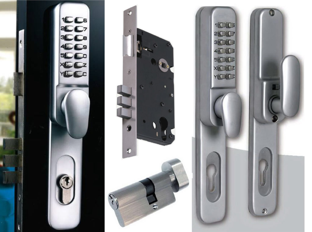 Это самый распространённый вид защитных устройств. Кодовые замки на двери удобны в использовании, недороги, не требуют подключения электричества. Ключи тоже не понадобятся. Последовательный набор или одновременное нажатие кодовых цифр освобождает ригель и открывает дверь. Возвратно-поступательный пружинный механизм помещает запорный язычок на прежнее место и закрывает устройство. Механический замок устанавливается с кнопочным набором или с поворотным роликом.