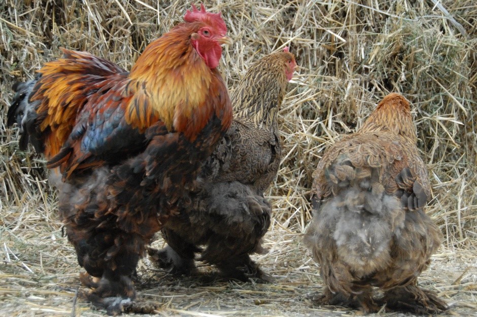 - Оперение не менее пышное, чем у крылатых красоток, но разница лишь в том, что у петухов более выражен хвост и крылья. Лапы тоже покрыты густым пером, из-за чего создается впечатление, что их вообще нет.