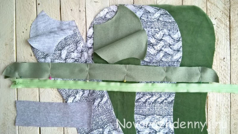 1. Из рибаны выкроите прямоугольник высотой 5 см и длиной 15 см. Сразу можете согнуть его вдоль изнанкой внутрь и загладить утюгом. Из подкладочной ткани выкроите одну деталь спинки и две полочки. А из основной ткани – одну деталь спинки, две полочки и две закругленные на концах детали планки, которая будет закрывать молнию внутри кокона. Планка должна быть шире молнии, а по длине ее нужно сделать суть короче внутреннего края полочек. Детали планки сложите вместе лицевыми сторонами внутрь и скрепите портняжными булавками.
