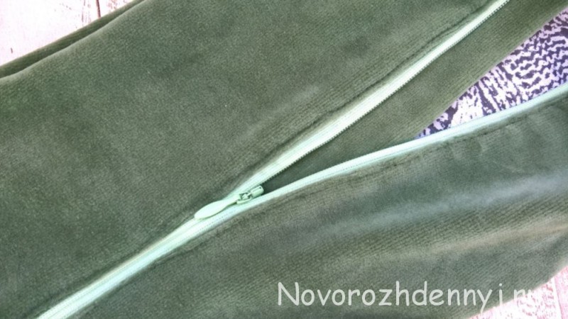 - Расстегните потайную молнию. Ту ее половинку, к которой прикреплена планка, вложите между основной и подкладочной тканью кокона и зафиксируйте ручным наметочным швом. Затем эту линию прострочите прямым швом на машинке.