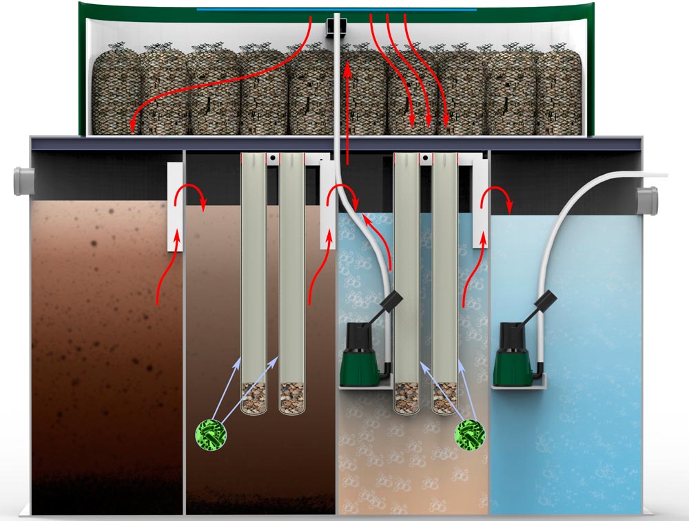 - Аэробная фильтрация – в третьей камере установлен насос, прогоняющий стоки через съемную биозагрузку, насыщая их кислородом. На данном этапе начинают работать аэробные бактерии, производится окончательное окисление углеводов и жиров. Очистка воды превышает 90%, наблюдается минимальное содержание органики;