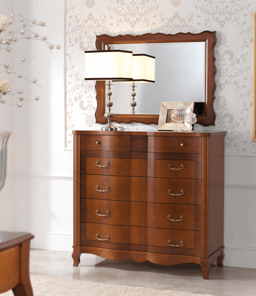 Радиусный комод создаёт обманчивое ощущение плавности, занимает меньше места, чем угловой, но он такой же вместительный. Такой шкаф красиво смотрится комплектом с зеркалом в резной полиуретановой раме с напылением под патину. Данная модель может дополнять весь комплекс мебели или быть самостоятельным центром внимания гостей.