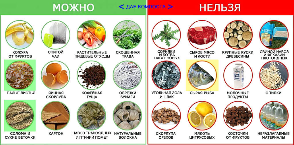 Нельзя вносить экскременты животных, жиры, кости, испорченные продукты, томатную и картофельную ботву, семена сорняков, обработанные гербицидами растения, неорганический мусор (резину пластик, стекло, синтетику).
