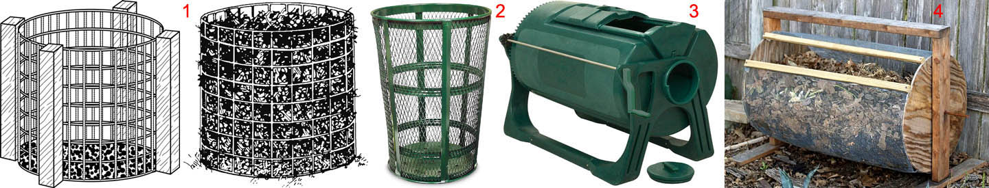 По первому принципу работает садовый компостер – корзина, поз. 1 и 2 на рис. Диаметр – ок. 1,2 м; высота – ок. 1,5 м. Из прямой корзинки без дна компост весной полностью не выбирают (слева на поз. 1): оставляют его 5-10 см, которые обильно известкуют. Это убьет выжившие особо стойкие зародыши вредоносных организмов. В конической корзинке с дном (поз. 2) они и так не выживут, если поставить ее на кирпичи и т.п. подставки толщиной от 7-10 см.