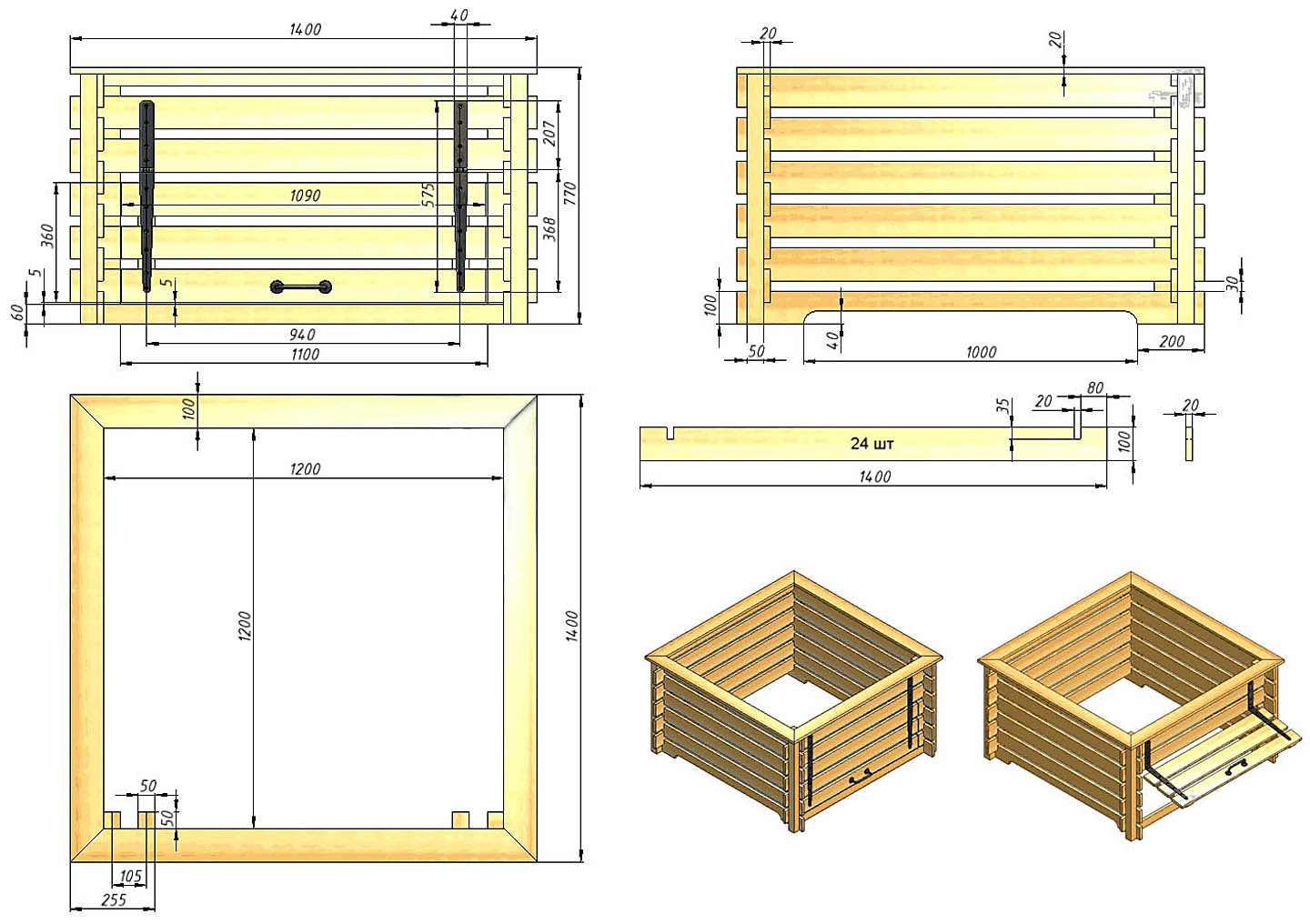 Чертежи компостного ящика из дерева для двух способов компостирования