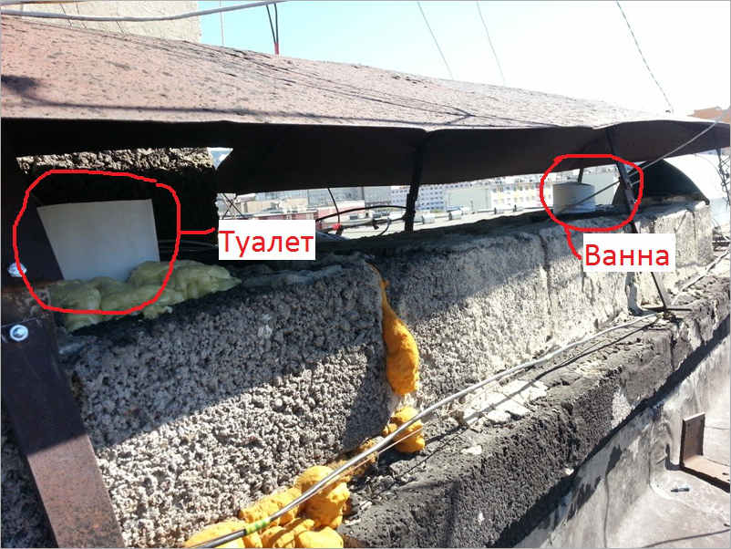 Для многоквартирного дома, утепление следует начать с тщательного изучения выходов воздуховодов. На чердаке или крыше находится некая постройка, в которую выходят вентиляционные каналы всего стояка. Если воздуховоды изготовлены из оцинковки или азбестоцемента, то пространство между ними не заделано. Именно в эти промежутки между трубами и заходит холодный воздух, тем самым охлаждая воздуховод, который встречаясь с теплыми воздушными массами, и превращают влагу в конденсат.