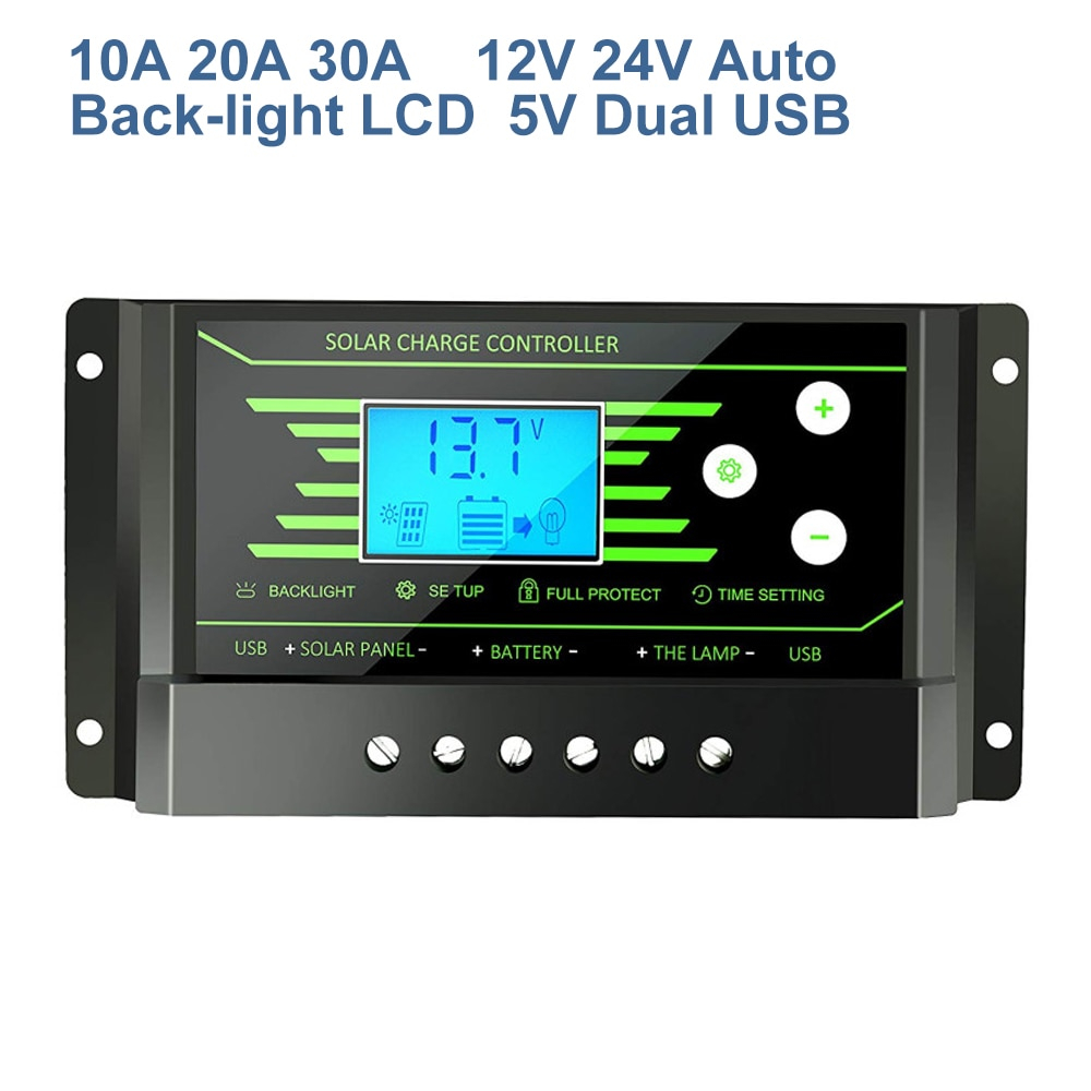 Модель контроллера заряда аккумулятора с Алиэкспресс с PWM-функцией в нескольких вариантах исполнения, в зависимости от силы тока 30A, 20A, 10A напряжением 12-24В и мощностью от 120 до 360Вт. Подходит для различных типов свинцово-кислотных батарей с таймером нагрузки. Установлен двойной светодиодный дисплей. Возможно подключение и управление через USB-порт. На базе контроллера реализована 4-ступенчатая зарядка Boost, ABS, Equalization, Float благодаря использованию промышленного микропроцессора STM 8. Имеется опция таймера и запоминания ранее настроенных параметров. Встроена защита от перегрева, обратного тока, короткого замыкания, разрядки и перегрузки. На устройство предоставляется гарантия производителя 12 месяцев.
