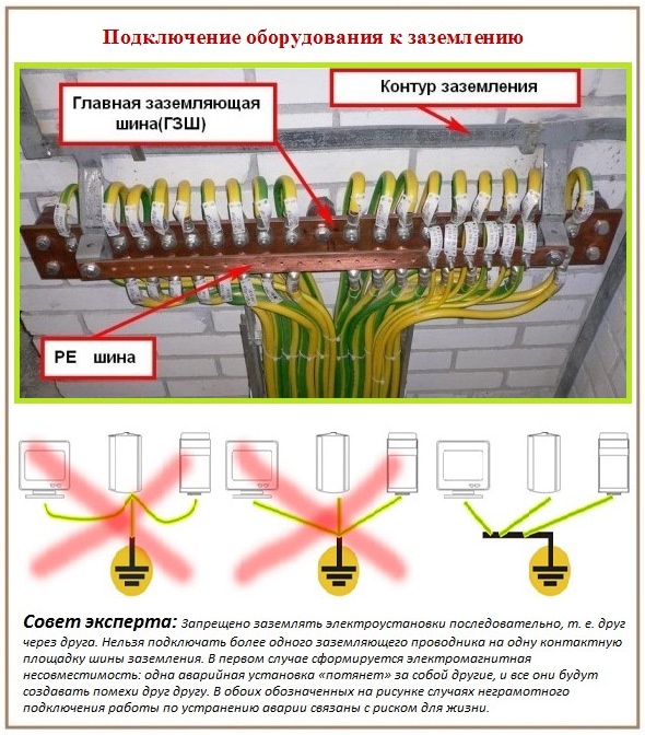 Контур заземления соединяется в двух местах с помощью заземляющих проводников с внутренней заземляющей сетью дома. Она может быть выполнена так, как показано на этом фото: