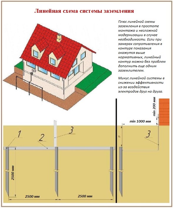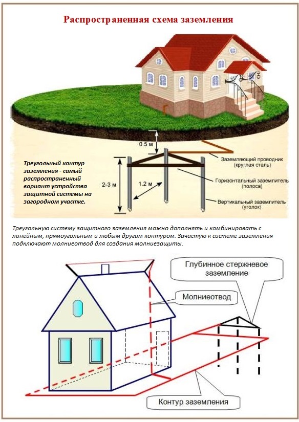 Защитный контур выполняется в форме треугольника или прямой линии. Под землей он соединяется с контуром заземления жилого помещения – это обязательное условие.