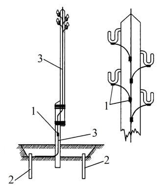 На опорах при монтаже может быть сделан заземляющий спуск из проволоки или катанной стали. Он также может отсутствовать. На рисунке ниже показана конструкция опоры с заземляющим спуском.