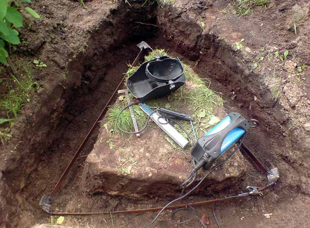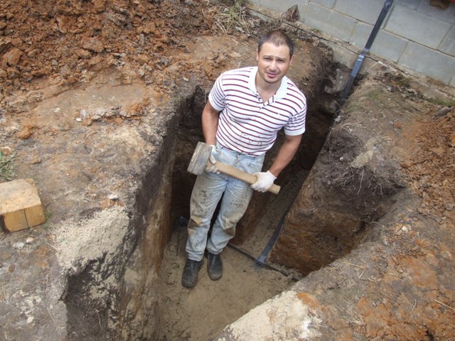 - Электроды заглубляют в грунт при помощи кувалды так, чтобы они возвышались над дном котлована или траншеи на 20 см.