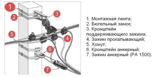На фото ниже изображено, как нужно соорудить повторное заземление ВЛИ основного проводника с использованием прокалывающего зажима на проходном столбе, без отвода. Осуществлять подобное необходимо на каждой третьей опоре ВЛ и на столбе, который ведет к жилому зданию.