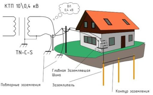 На практике схема TN-C-S представляет собой современное развитие предыдущей TN-C системы. Как и предыдущий вариант, в ней от питающей подстанции к потребителю выдается четыре линии, из которых три отведены для фазных проводов, а четвертый под совмещенный PEN проводник. Но, на определенном участке цепи выполняется разрыв PEN жилы, а из нее отдельно выделяется нулевой провод и заземление. Для последнего устанавливается отдельный заземляющий контур в месте раздела, обеспечивающий необходимую величину электрического сопротивления току растекания.
