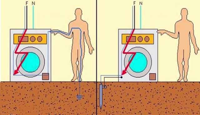 Чем это чревато? Прикосновение к такой поверхности в обычных условиях приведет к ощутимому удару током. Если же в этот момент вы стоите босиком на сыром бетонном полу или держитесь рукой за стальную трубу центрального отопления или водопровода, то разряд может оказаться смертельным. Причина в том, что электрический ток ищет путь наименьшего сопротивления к земле, а вы замыкаете цепь на себя и становитесь проводником, что хорошо видно выше на схеме.