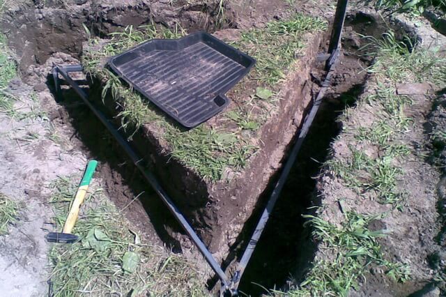 - Между точками установки вертикальных заземлителей прокопайте траншею глубиной не меньше 500 мм, а лучше – 70 см, как показано на фото. На этом уровне пройдет соединительная полоса.