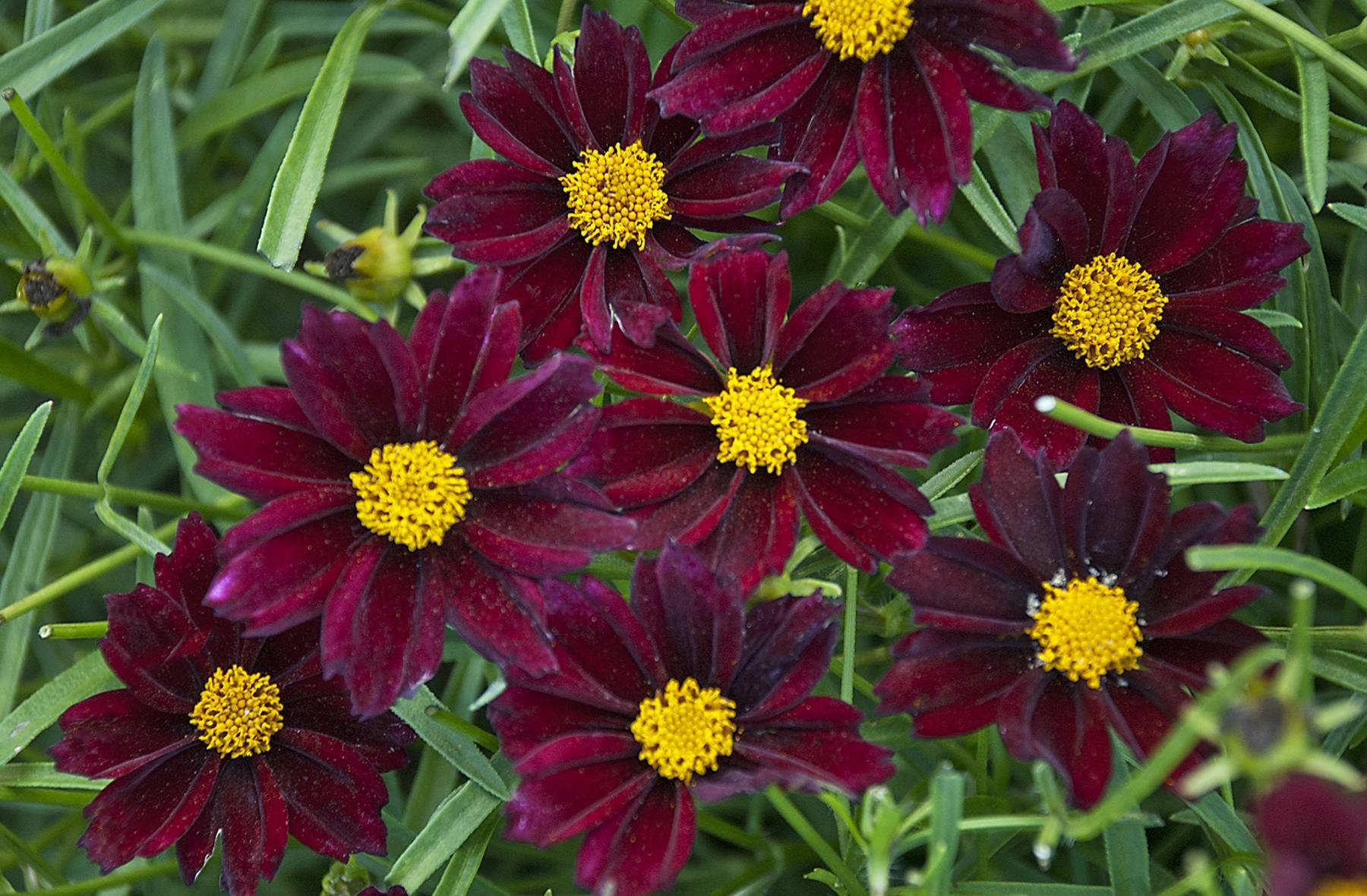 | Красильный (Coreopsis Tinctoria) | Дружно цветет с июля по сентябрь желто-багряными плоскими соцветиями. В середине видимо выступает плотный бордовый шарик, состоящий из множества тычинок | ![]() |