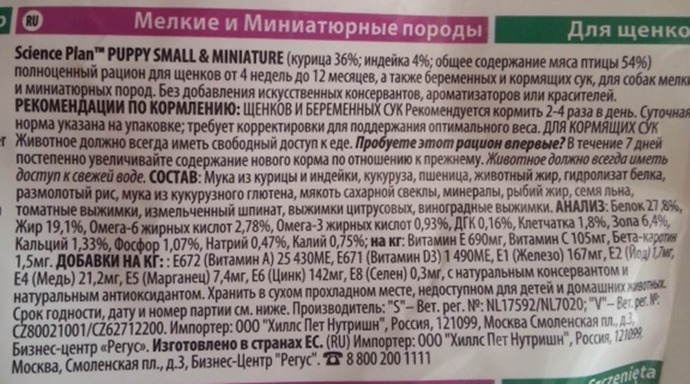 Еще один весомый плюс корма Hills – полное отсутствие искусственных антиоксидантов, консервантов, вредных ароматизаторов и красителей. Например, корм Роял Канин содержит в составе пагубный для здоровья консервант – сорбат калия, в рецептуре корма Рос Пес числится непонятный антиоксидант без уточнения, в рационах Пробаланс – антиоксиданты Е320 и Е321, а в кормах Пурина Уан и Про План содержится сомнительная вкусоароматическая добавка.