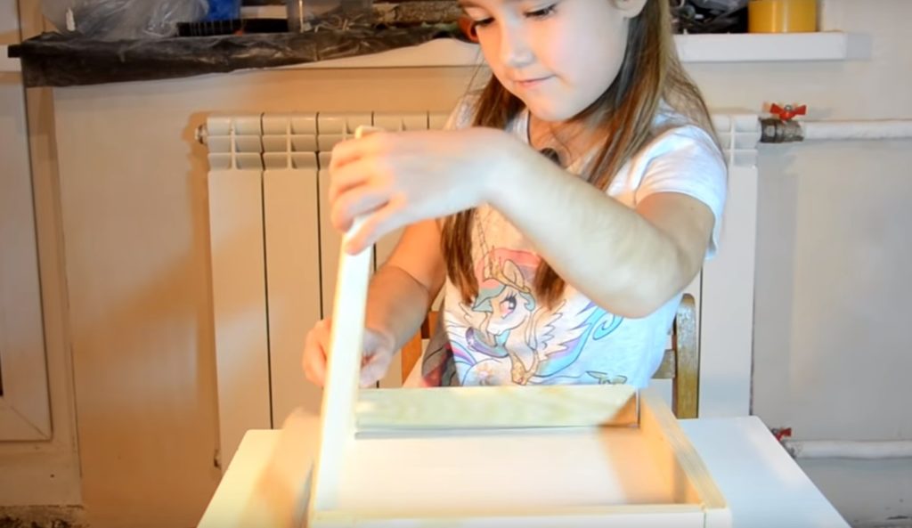 Покрасьте коробку в любой цвет и просушите. Разрежьте деревянные палочки пополам и приклейте к верху коробки. Сделайте из них переднюю и заднюю части крыши, как показано в видео.