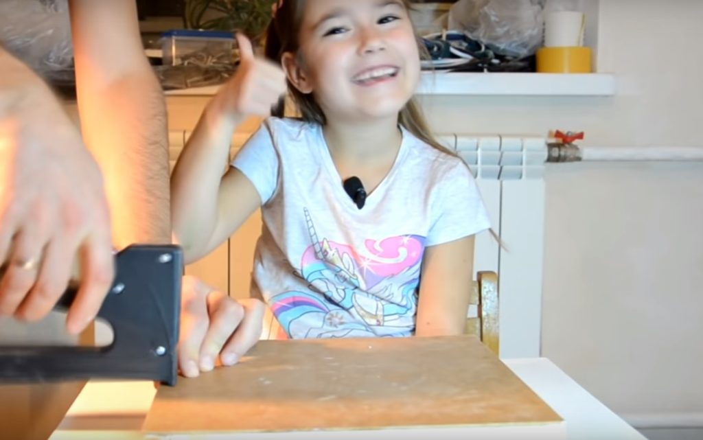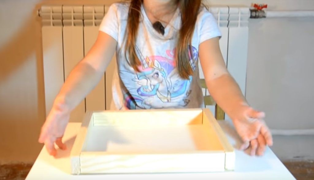 Просверлите в углах фанеры по одному отверстию тонким сверлом. С обратной стороны просверлите сверлом потолще, но не насквозь. Прикрутите в углах толстые ветки, с одной стороны — одну среднюю, а по бокам — по две средние. Подробности показаны в видео.