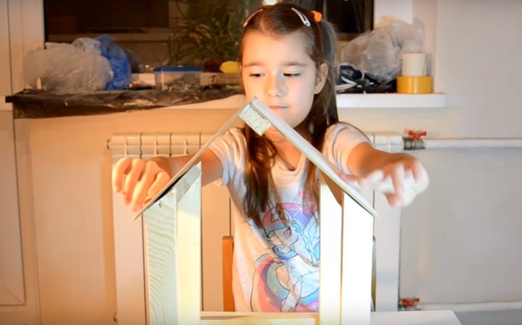 Шаг 7. Далее изготавливается крыша. Требуется соединить два листа ДВП под углом 90 градусов. Соединение производится при помощи небольшого «конькового» бруска длиной, равной длине ската. Стоит помнить, что крыша должна немного нависать над поддоном кормушки, а значит, скаты должны быть изготовлены с учетом этого фактора.