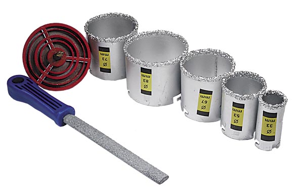 Алмазные коронки имеют напыление из алмазной крошки, которое и соприкасается с рабочей поверхностью плитки. Такие фрезы отличаются высокой прочностью, с их помощью можно качественнее обработать твёрдое покрытие декоративного материала. Выпускаются алмазные коронки с диаметром рабочего кольца от 10 мм и более. Можно купить как отдельную насадку, так и в готовом наборе из нескольких штук разного размера.