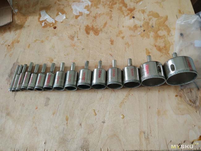 Ещё одна рекомендация – покупать коронки лучше набором. Таким образом, можно сэкономить деньги и избежать ошибки выбора неверного диаметра. Большинство мастеров отдают предпочтение именно наборам с разными видами коронок. Благодаря нехитрым приспособлениям на керамической, керамогранитной, кафельной и мозаичной плитке получаются ровные, без сколов и трещин края.