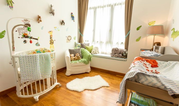 Римские, рулонные или ночные шторы обеспечат крепкий сон малыша. А прозрачный тюль с умиротворяющим орнаментом подойдет тем, кто боится спать в темноте.