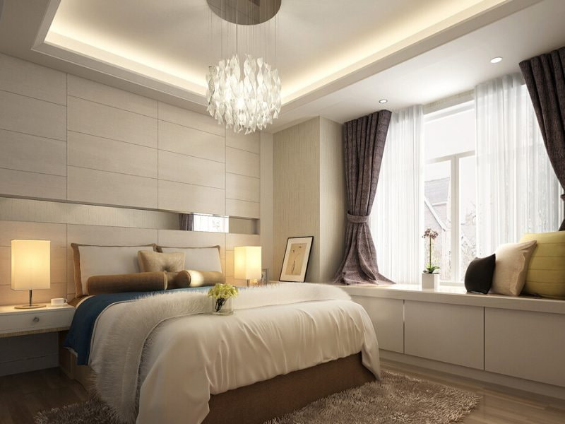 Традиционным оформлением оконных проёмов спален считается сочетание тюля и занавеси в пол. Это придаёт помещению уединённость и уют. Цветовая гамма подбирается в зависимости от интерьера.