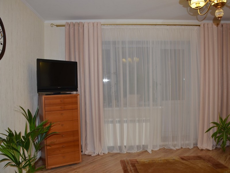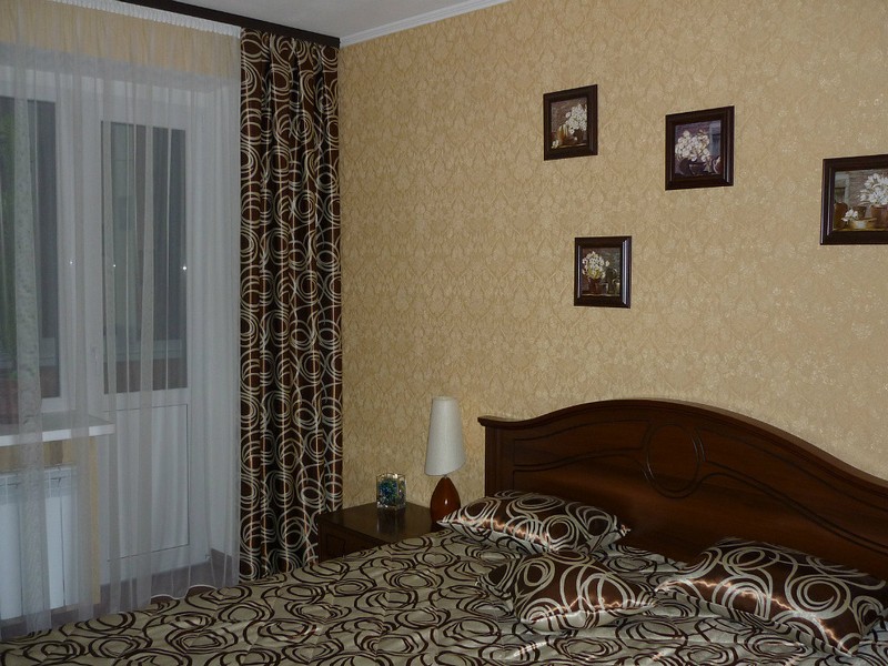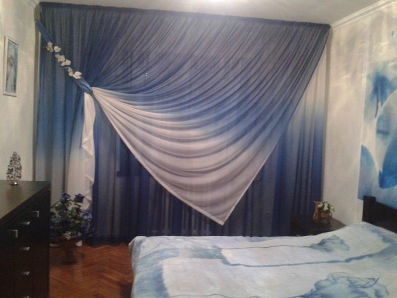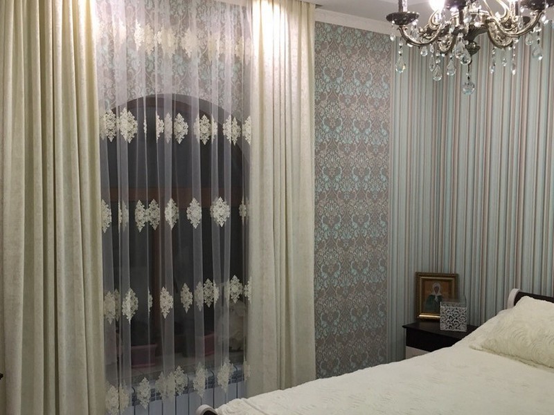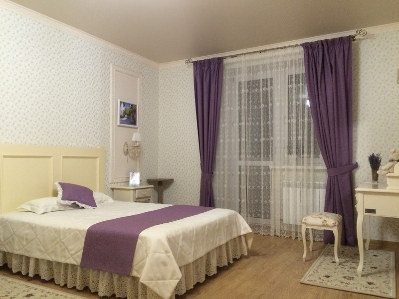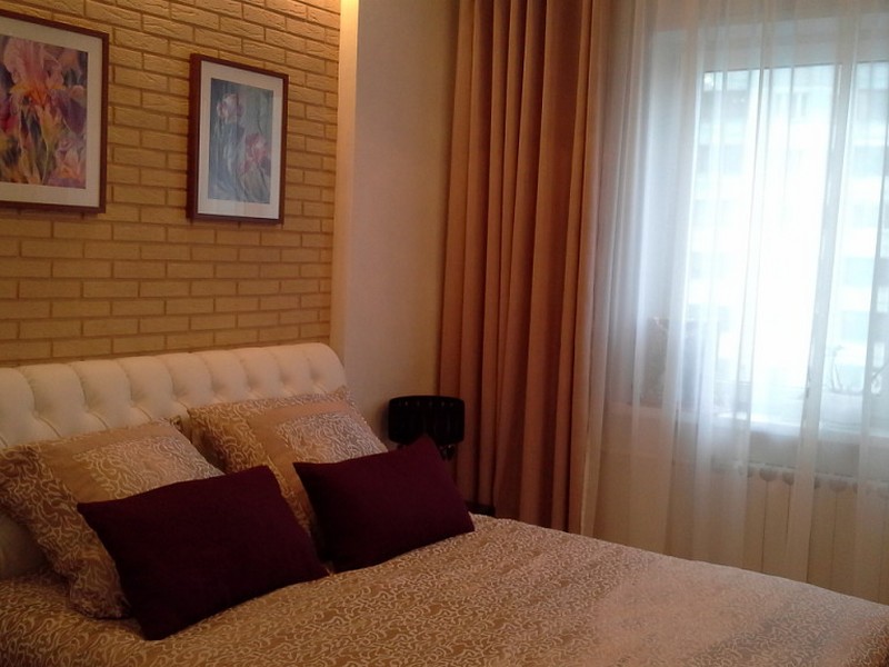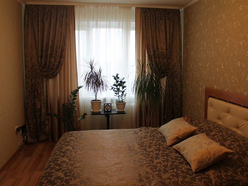 - а также нужно определиться с длиной штор. В спальню подходящий вариант – короткие занавески, они обеспечивают свободный доступ к окну и пропускают тепло от батареи в отопительный сезон.