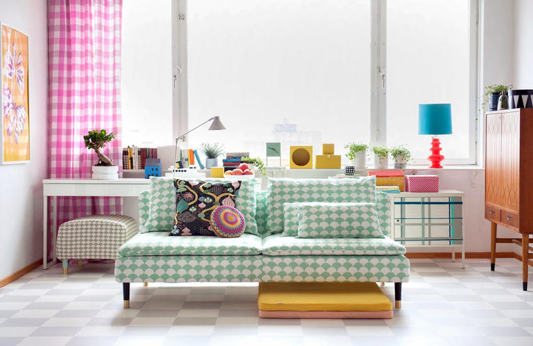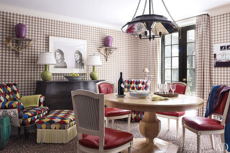 Нестандартные, ассиметричные цветовые решения узора Мадрас будут уместны в современных интерьерах.
