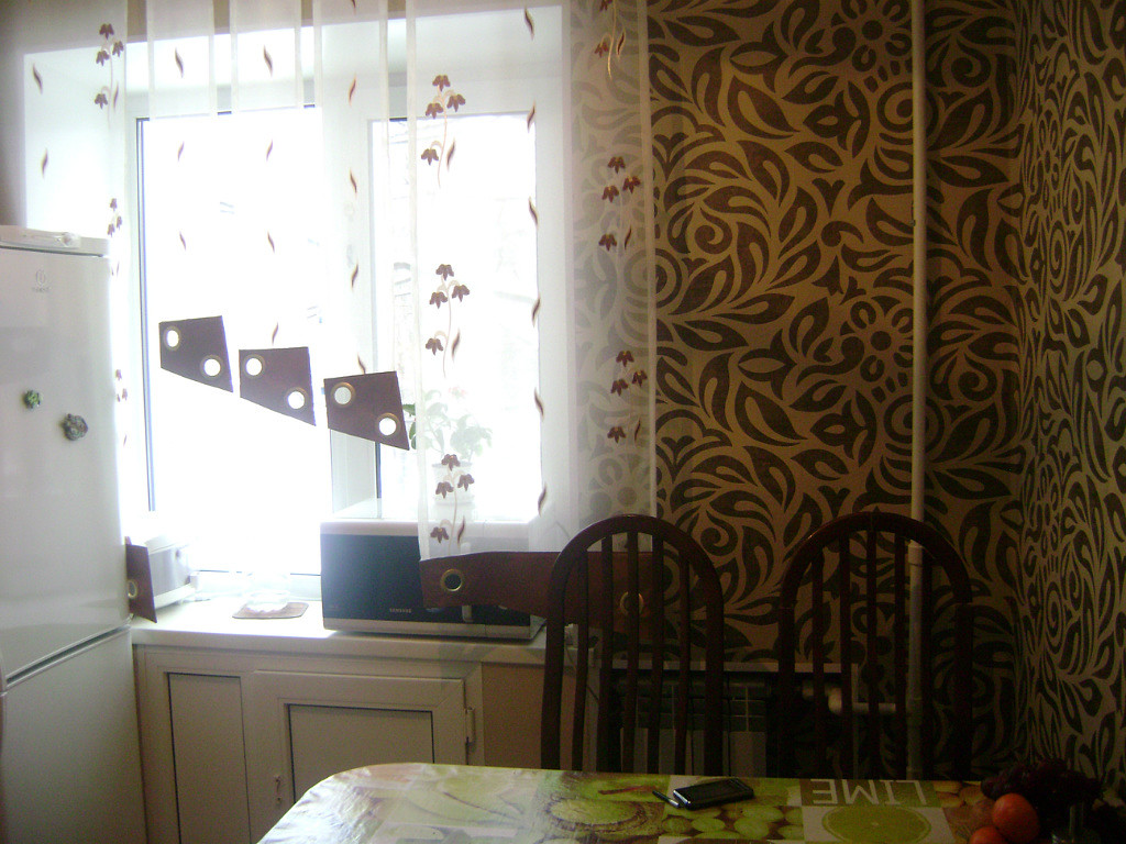 Так же можно использовать шторы-кафе. Это раздвижные занавески. Дополняя их оборками, складками, вы сможете делать свою кухню уютной. Расцветки традиционно используются уютные: клетка, мелкий цветочек.