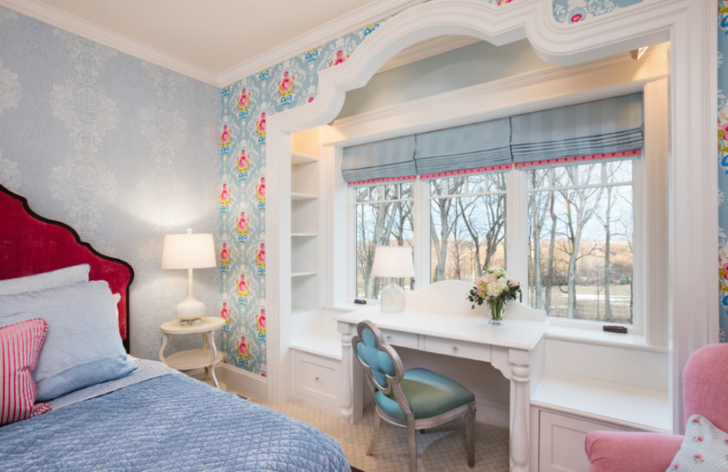 - В этой подростковой комнате все продумано. Подоконник играет роль письменного стола, поэтому здесь уместны только короткие шторы. Вся стена с окном работает как единое целое. В небольшом пространстве комнаты используется каждый сантиметр.
