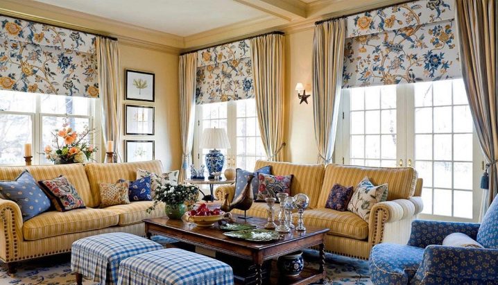 В гостиной стиля Прованс римские шторы с изумительным по красоте принтом сочетаются с длинными полосатыми шторами. Стилистическое единство этого интерьера поддерживают текстильные аксессуары: подушки, обивка диванов.